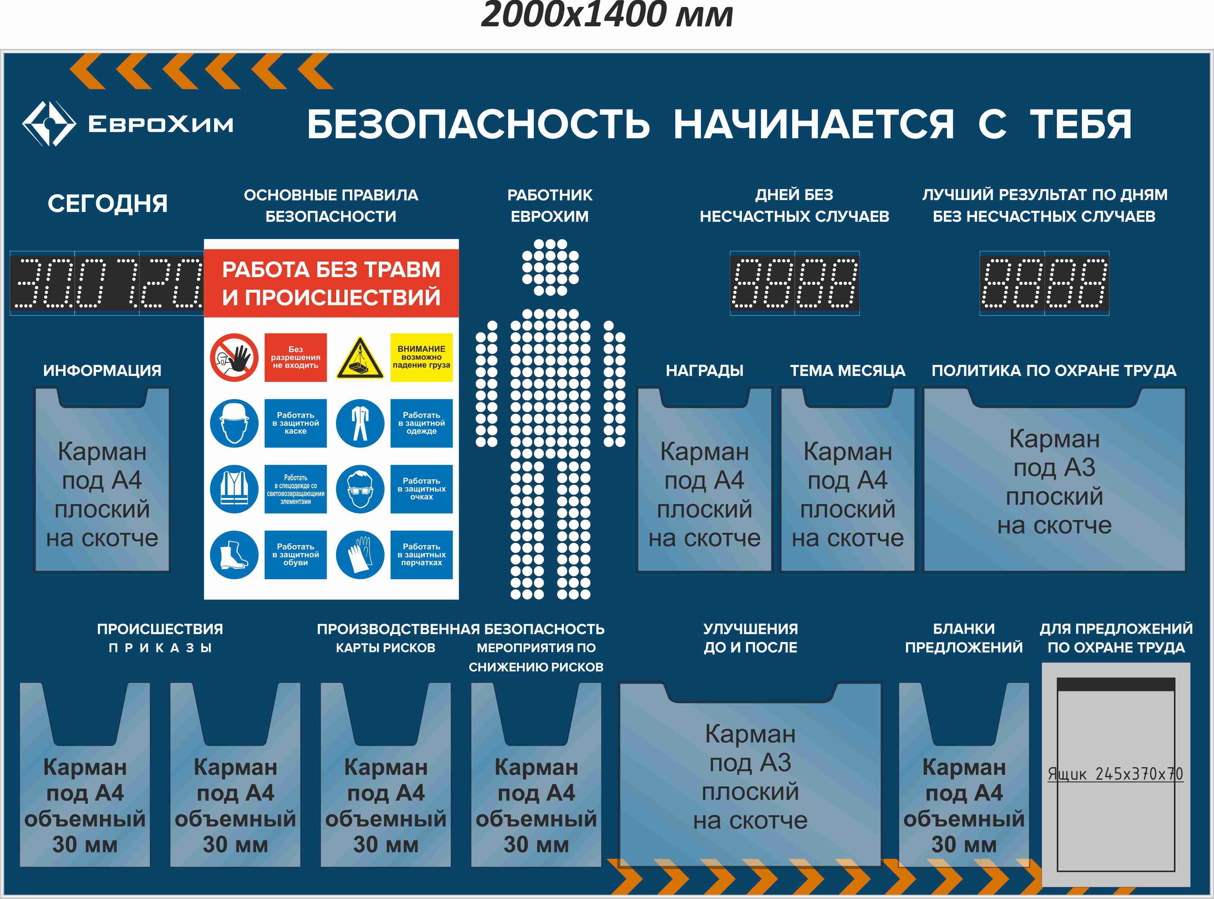 Стенд с фризом с пультом ДУ, 220 В. Над каждым карманом наименование. 3 диодных экрана сверху (сегодня "дата" автоматическая смена с возможностью обновления, "дней" автоматическая смена с возможностью обновления, "лучший" - автоматическая смена с возможностью обновления). Диодный экран "работник ЛокоТех (свечение: основной цвет белый. при получении травмы "голова или корпус или руки или ноги" данный на "теле" участок меняет цвет на красный. размер "человека" 594х300). "Основные правила безопасности" размер А2 наносится на ¶стенд - индивидуальная отрисовка. (Карман А4 вертикальный плоский-3шт на скотче, Карман А3 горизонтальный плоский-2шт на скотче", карман А4 верт.объемный-5 шт. Ящик предложений по ОТ с замком из металла - 1 шт размер А4. . (2 000x1 400x90)