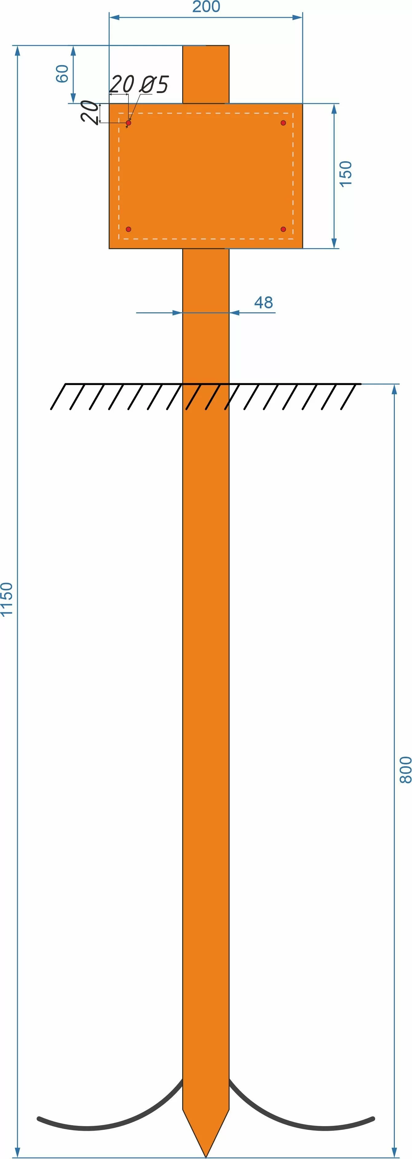 Конструкция межевой знак, 200x1800, труба оцинкованная D76х3,5 мм L=1150 мм, со сплющенным нижним основанием, якорем пруток D5 мм. Табличка 200х150 оцинкованный 0,8 ПО без печати.Код: ЦБ-00119463