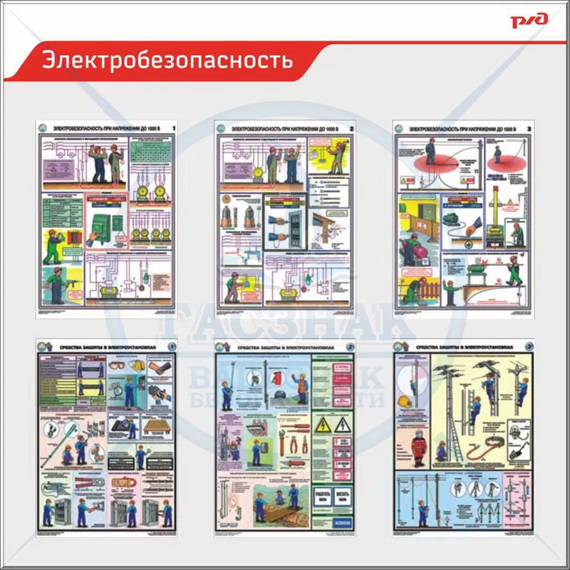 Стенд Электробезопасность - порядок действия при поражении электрическим током (6 плакатов А3, 1 карман А4, перек. сист. А4 на 5 рам (1500х1200; Пластик ПВХ 4 мм, алюминиевый профиль; )