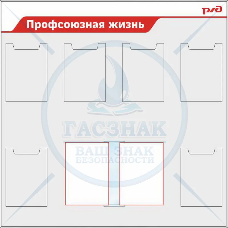 Стенд Уголок по технике безопасности РЖД, 1 карман А3 гор, 4 А4 объемн., 6 карманов А4 пл. (1650х1100; Пластик ПВХ 4 мм, алюминиевый профиль; )
