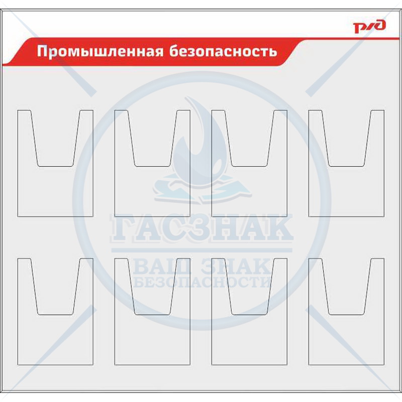 Стенд. Стенд Уголок по охране труда ( 4 кармана формата А4, плоских, 2 кармана формата А4, объемных) стиль РЖД с логотипом, Логотип (1000х1000; Пластик ПВХ 4 мм, алюминиевый профиль; )