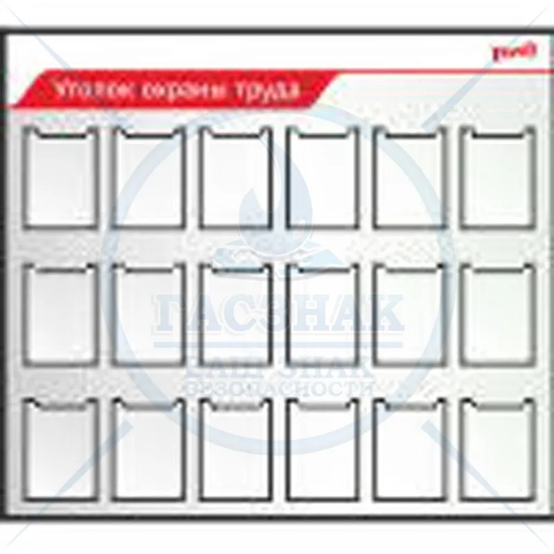Стенд. Стенд Уголок по охране труда ( 4 кармана формата А4, плоских, 2 кармана формата А4, объемных) стиль РЖД с логотипом, Логотип (1000х1000; Пластик ПВХ 4 мм, алюминиевый профиль; )
