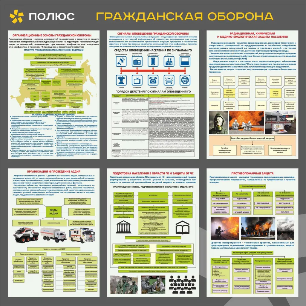 Стенд Действия населения при ГО и ЧС, 7 плакатов военные знания А3, 2 кармана А4. (1400х1200; Пластик ПВХ 4 мм; Алюминиевый профиль)