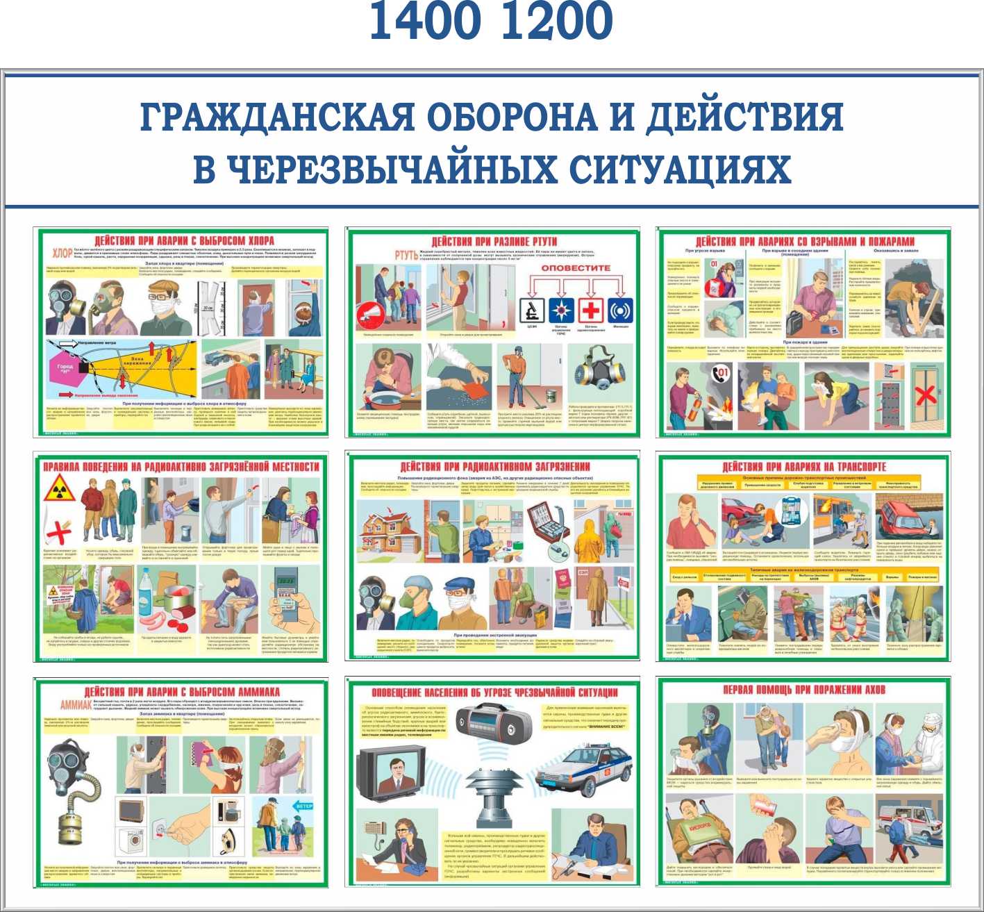Стенд Гражданская оборона и ЧС. (9 плакатов А3) (1400х1200; Пластик ПВХ 4 мм, алюминиевый профиль; )