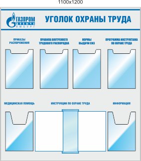 Стенд Охрана труда 1 карм. А3 гориз., 4 карм. А4 объемн. , 6 карм. А4 плоск. (1400х950; Пластик ПВХ 4 мм, профиль пластиковый белый)