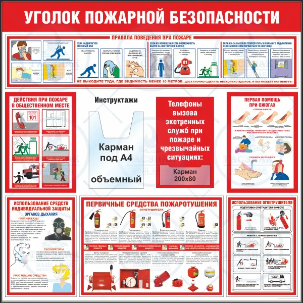 Стенд для ОТ пожарная безопасность, 6 плакатов А3 (1 200х1 000; Пластик ПВХ 4 мм, Алюминиевый профиль)