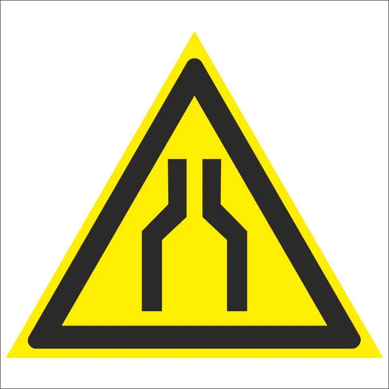 На территории заводов и иных предприятий возможно наличие участков, в пределах которых проход (проезд для транспортных средств) сужается или затруднен из-за выступающих вперед конструкций. Эти места необходимо проходить (проезжать) с особой осторожностью. Предупредить людей о возможной опасности позволяет знак «Осторожно. Сужение проезда (прохода)». Его размещают в складских помещениях и других зонах, где присутствуют подобные сужения или усложняющие проход конструкции.Продукция произведена на территории Российской Федерации и соответствует критериям подтверждения российского происхождения согласно Постановлению Правительства РФ № 719. Номера реестровых записей: 10651105, 10626803. Код ОКПД 2: 32.99.53.190 и 22.29.29.190.